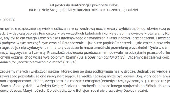 Hierarchowie w liście, który był czytany w Niedzielę Świętej Rodziny w polskich kościołach zwrócili się do przedstawicieli wszystkich pokoleń polskich rodzin.