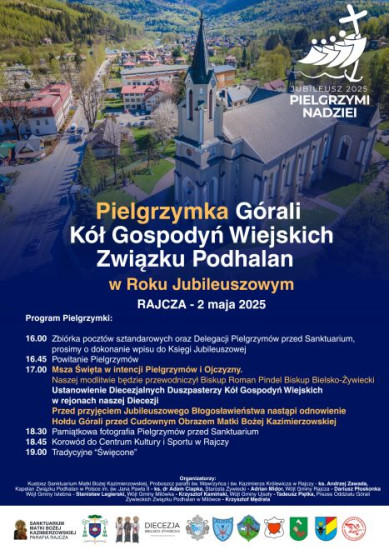 2 maja AD 2025 (w piątek) odbędzie się uroczysta Pielgrzymka Górali, Kół Gospodyń Wiejskich i Związku Podhalan w Roku Jubileuszowym do kościoła w Rajczy.