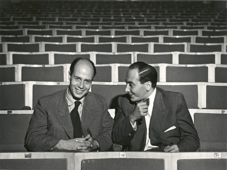 Erwin Axer i Jerzy Lutowski ( z prawej), na próbie „Ostrego dyżuru” w Teatrze Narodowym w Warszawie (1955). Fot. Edward Hartwig, Franciszek Myszkowski. Źródło: Archiwum Artystyczne Teatru Narodowego