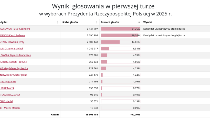 Oficjalne wyniki pierwszej tury wyborów Prezydenckich 18 maja RP 2025