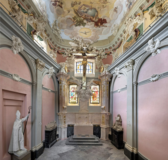 Kaplica została zainicjowana przez Annę z Sapiehów w latach 1769–1771, częściowo sponsorowana z funduszy kościelnych. Wnętrze pokryte polichromią autorstwa Stanisława Stroińskiego. Ołtarz oraz figuralna dekoracja stiukowa, wykonane przez Jana Obrockiego, powstały prawdopodobnie w latach 1775–1777. W centrum kompozycji umieszczono drewniany gotycki krucyfiks, wykonany przez Mikołaja Haberschracka w Krakowie, a w 1473 roku sprowadzony do Lwowa.