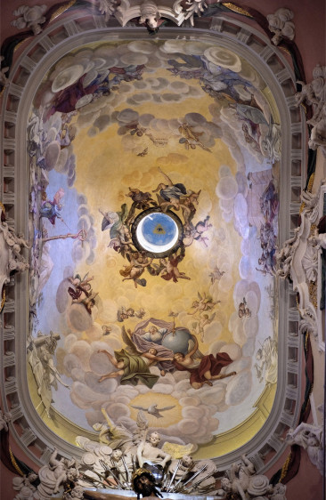 Za ołtarzem okna z witrażami „Wizja św. Genowefy” i „Wizja św. Antoniego”, wykonanymi w 1880 roku. Sklepienie przedstawiają sceny: „Bóg Ojciec z aniołami”, „Duch Święty”, „Adoracja Baranka Eucharystycznego”, „Wąż miedziany”, „Pokłon pasterzy” i „Alegorie cnót”, autorstwa Stanisława Stroińskiego, wykonane w latach 1771–1775. Latarnia otoczona tańczącymi aniołami trzymającymi wieniec z Okiem Opatrzności. Po bokach nagrobki arcybiskupów Wacława Hieronima Sierakowskiego i Ferdynanda Onufrego Kickiego wykonane przez Franciszka Olędzkiego przy współpracy Piotra Barzyckiego i Józefa Duńczewskiego z około roku 1784. Po lewej posąg św. arcybiskupa lwowskiego Józefa Bilczewskiego.