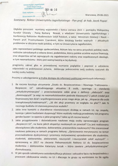 Organizacje, m.in. Stowarzyszenie Rodzice Chronią Dzieci, wystosowali list do Rektora UJ z prośbą o wyjaśnienie palących kwestii.
