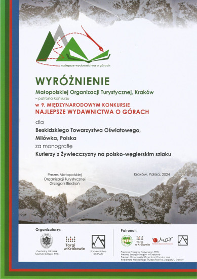 Miło nam przekazać, że nasza publikacja "Kurierzy z Żywiecczyzny na polsko - węgierskim szlaku" autorstwa Władysława Motyki została wyróżniona w 9 Międzynarodowym Konkursie "Najlepsze wydawnictwa o górach" w czasie 27 Międzynarodowych Targów Książki w Krakowie, które odwiedziło około 56 tysięcy osób. Wyróżnienie odebrał autor. Serdeczne gratulacje!