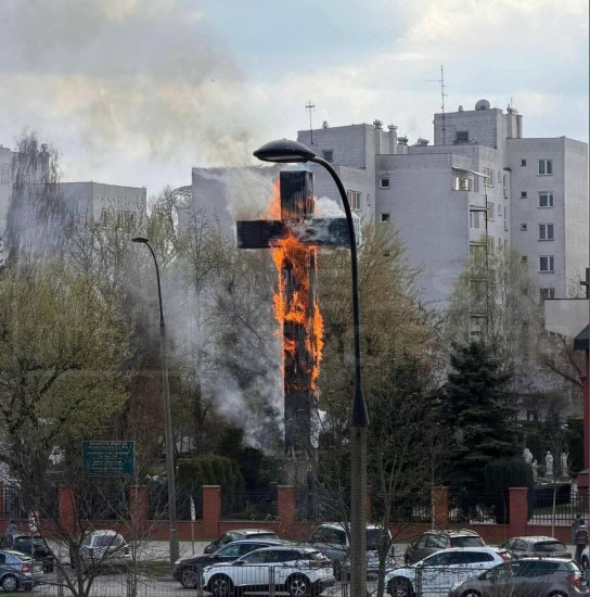 „W dniu 3.04.2026 r. około godziny 15.00 spłonął drewniany krzyż stojący na terenie parafii Św. Maksymiliana Kolbego w Warszawie, przy ul. Rzymowskiego 35.