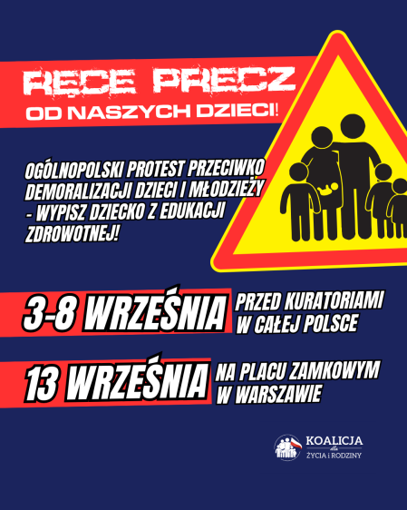 Na protestach będzie można otrzymać formularze rezygnacji z edukacji zdrowotnej oraz ulotki informacyjne. Przyjdź. Zaprotestuj. Chroń dziecko.