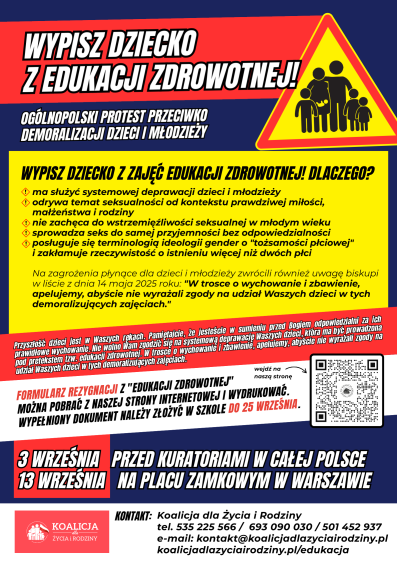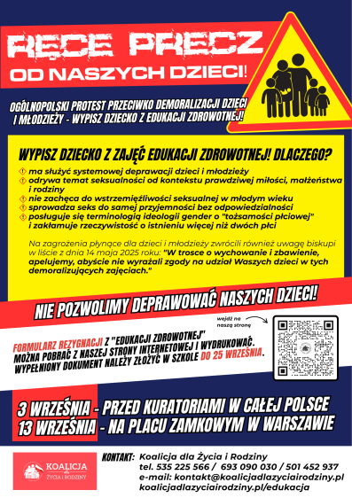 Zapraszamy Państwa na Manifestacje przeciwko wprowadzonemu od 1 września 2025 roku, przez Ministerstwo Edukacji Narodowej, nowego przedmiotu „Edukacja zdrowotna”.